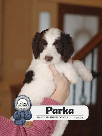 Parka is a female F1b Standard Sheepadoodle born December 12, 2025.